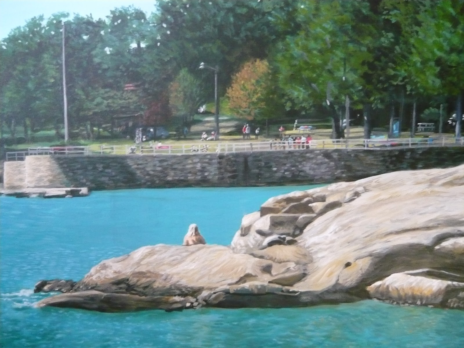 In the case of this painting, still a work in progress, I see the shapes of the stone wall, the rocks, and the treeline. Once those are in place, I start to focus on the details. There are changes in color in the trees, the water, and the rocks. Once I get those done, I notice there are people in the park, and picnic tables, benches, even a car. As I keep working, I start to see that the shadows come into focus, and there is a hidden roof there and a couple of boulders I missed earlier, when I was too busy trying to fit everything in. I even discover that there is a heart shape in one of the rock formations in the foreground. It's little things like that which I so enjoy discovering as I paint. In every painted scene, there are secrets that only reveal themselves to me when I have enough understanding of the scene I am painting to recognize them.